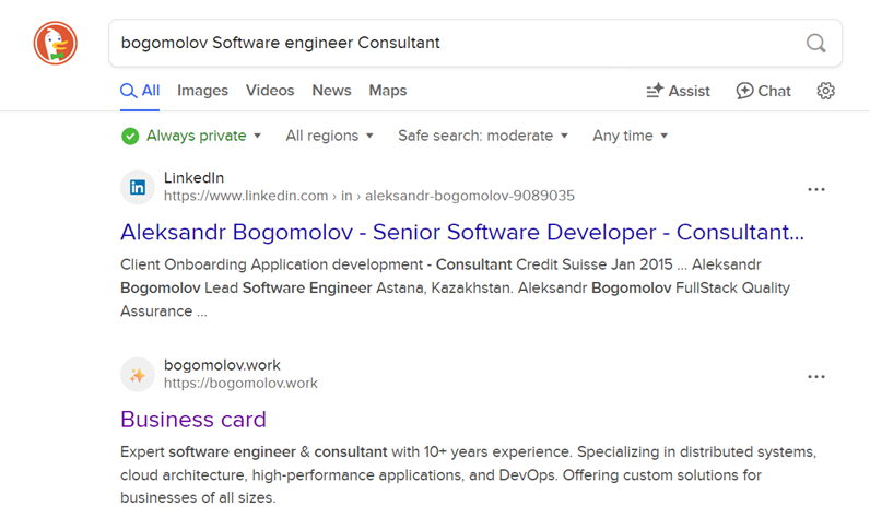 | Software engineer & Consultant site:bogomolov.work | ✅ | ❌ | ✅ |